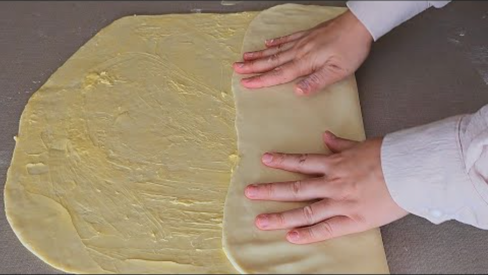 Tartinez à nouveau la pâte pliée avec du beurre, pliez la pâte en carré.