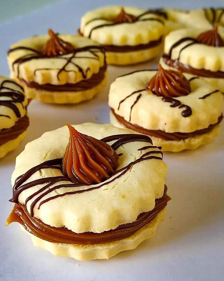 - Badigeonner les anneaux de chocolat fondu et déposer du dulce de leche sur les disques. Relier.