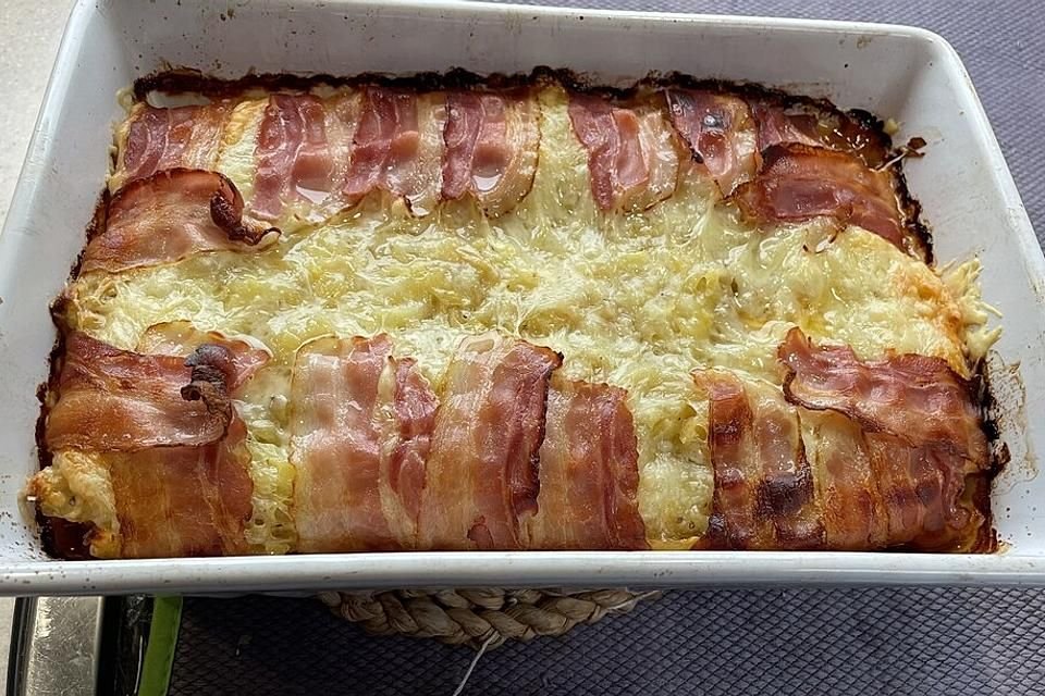 Ingrédients pour 4 portions 2-3 gros oignons 450 g de viande hachée, mélangée 1-2 cs de concentré de tomates Sel et poivre noir 200 g de bacon, en fines …