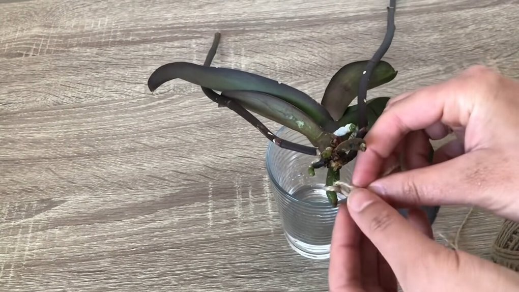 Une fois la ficelle de jute solidement attachée, placez l’extrémité dans un récipient rempli d’eau, à une profondeur d’environ 2 cm, veillant à ce que l’orchidée ne soit pas en contact direct avec l’eau. Positionnez le récipient dans un endroit lumineux, à l’abri de la lumière directe du soleil, et maintenez le niveau d’eau constant. Environ après 2 à 3 semaines, votre orchidée commencera à développer activement de nouvelles racines, grâce à l’humidité constante fournie par la ficelle de jute.