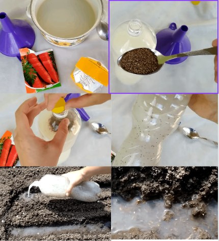 L’objectif est simple : verser uniformément le contenu de la bouteille le long des rangées. La fréquence de semis des carottes dépendra de la vitesse d’arrosage et de l’épaisseur du flux.