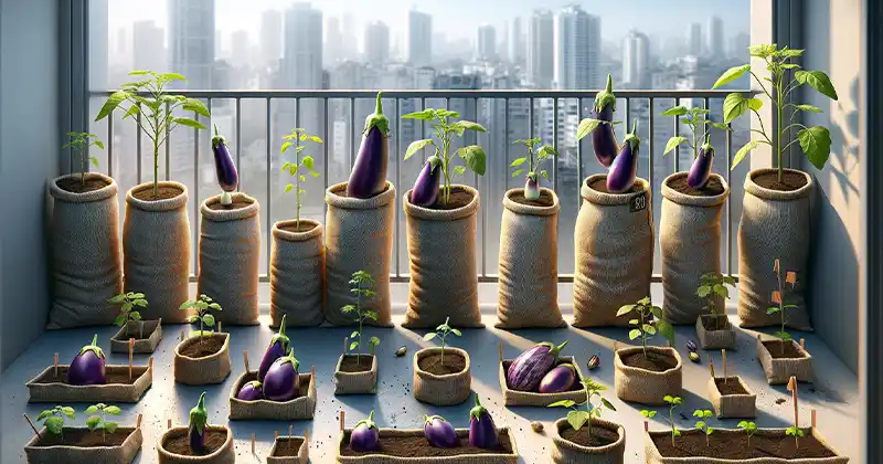 Chaque sac de terre doit contenir une aubergine pour éviter le surpeuplement. Vous pouvez poser les sacs horizontalement ou verticalement avec des ouvertures latérales. La ligne directrice standard est d’utiliser des conteneurs d’au moins 12 à 14 pouces de profondeur et de 16 à 18 pouces de diamètre, offrant suffisamment d’espace pour la croissance des racines.