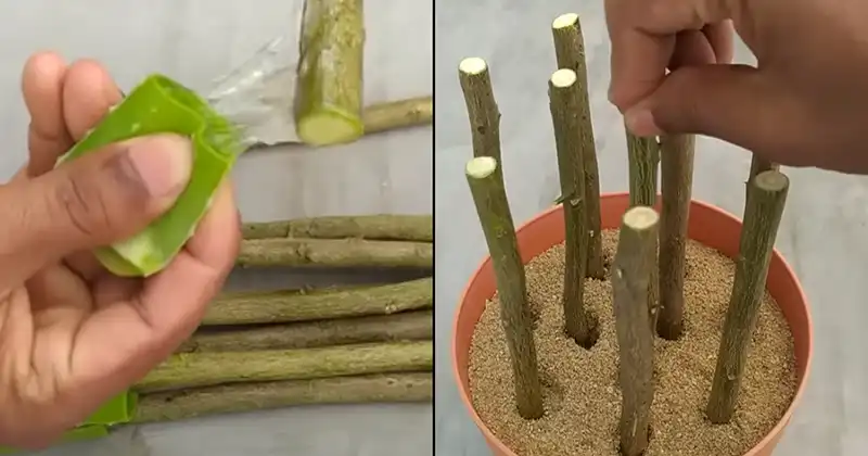 Étape 3 : Appliquer le gel d’aloe vera Frottez doucement le gel d’aloe vera sur la partie inférieure des boutures de citron. Ce gel agit comme une hormone naturelle d’enracinement et aide à protéger les boutures contre les infections potentielles. Assurez-vous de bien enrober les boutures.