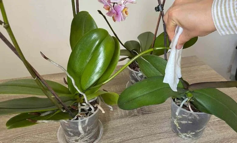 Pour nettoyer efficacement les feuilles de votre orchidée, un méthode simple consiste à utiliser des lingettes pour bébés utilisées pour changer les couches des nouveau-nés. Assurez-vous de choisir des lingettes avec un minimum de produits chimiques et de parfums. Les lingettes désinfectantes utilisées pour nettoyer les surfaces de la salle de bain, par exemple, ne sont pas recommandées car elles peuvent contenir trop de produits chimiques.