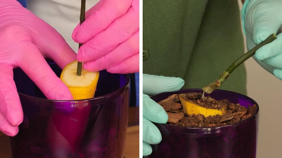 Le principe est similaire  à la méthode précédente, mais utilise une moitié de banane. Insérez la tige coupée dans la pulpe de la banane, puis recouvrez-la de mousse et attendez environ 2 semaines. Transplantez ensuite les boutures dans un pot avec du terreau.