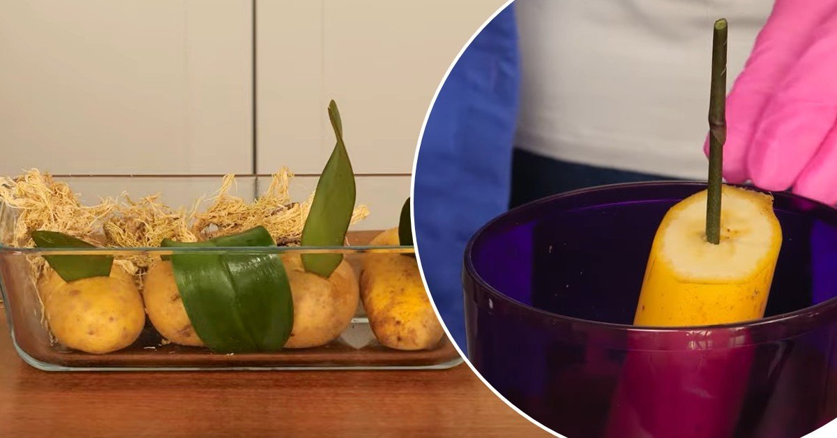 Le principe est le même que dans la méthode précédente. Au lieu d’une pomme de terre, utilisez une demi-banane. Placez la tige coupée de la fleur dans la pulpe, recouvrez la banane de mousse et attendez environ 2 semaines. Transplantez ensuite les plants dans un pot avec de la terre.