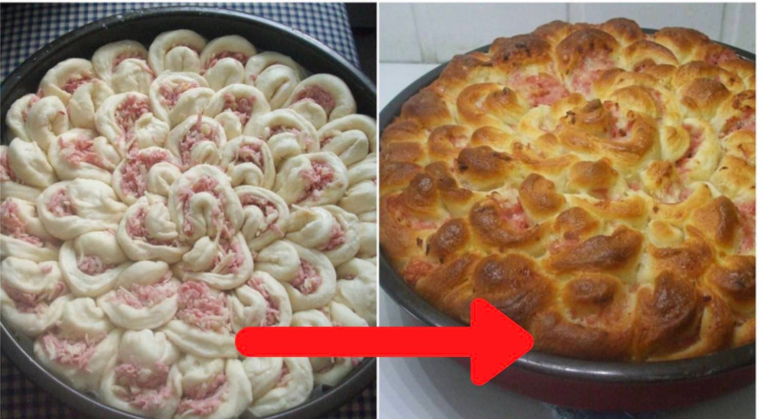Nous étalons la masse sur des roues, ajoutons du fromage et la plions en deux, puis à nouveau en deux et la plaçons dans un plat allant au four rond tapissé de papier d’un diamètre de 28 cm.