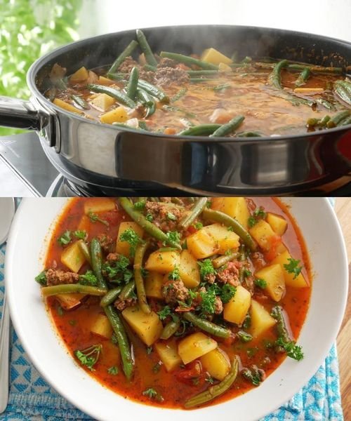 - Ensuite, faire chauffer l’huile dans une marmite à soupe et y faire revenir la viande hachée. Ajouter maintenant l’oignon et l’ail, assaisonner, mélanger avec le concentré de tomates et arroser avec le bouillon.