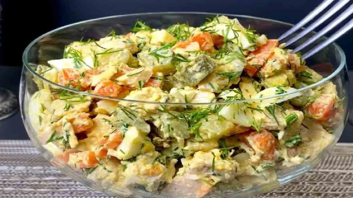 4 œufs durs 3 carottes cuites 400 g de blanc de poulet cuit 300 g de cornichons marinés Aneth haché 1 cs de moutarde 3 cs de crème 3 cs d’huile d’olive ½ cc de sel