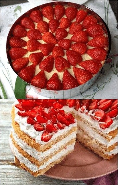 Dès que la crème fouettée est incorporée, répartir immédiatement la moitié de la crème sur le biscuit tendu et parsemer la moitié des fraises coupées en dés.