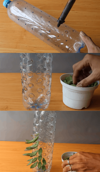 - Préparation de la bouteille : Marquez et percez des trous sur le côté de la bouteille en plastique, en veillant à ne pas toucher le fond.